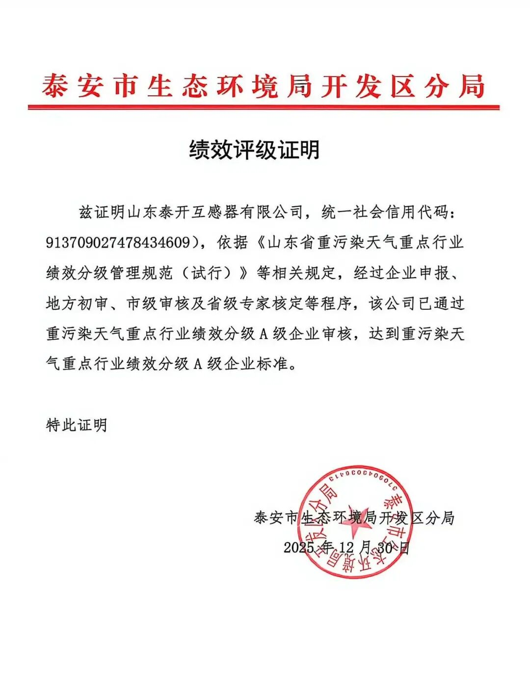 In the 2025 Environmental Performance Rating Assessment, Shandong Taikai Instrument Transformer Co., Ltd. passed the review for Grade A enterprise classification in key industries during heavy pollution weather, meeting the standards for Grade A enterprises in key industries under such conditions. This achievement marks the company as the first Taikai enterprise within the group to receive this honor.